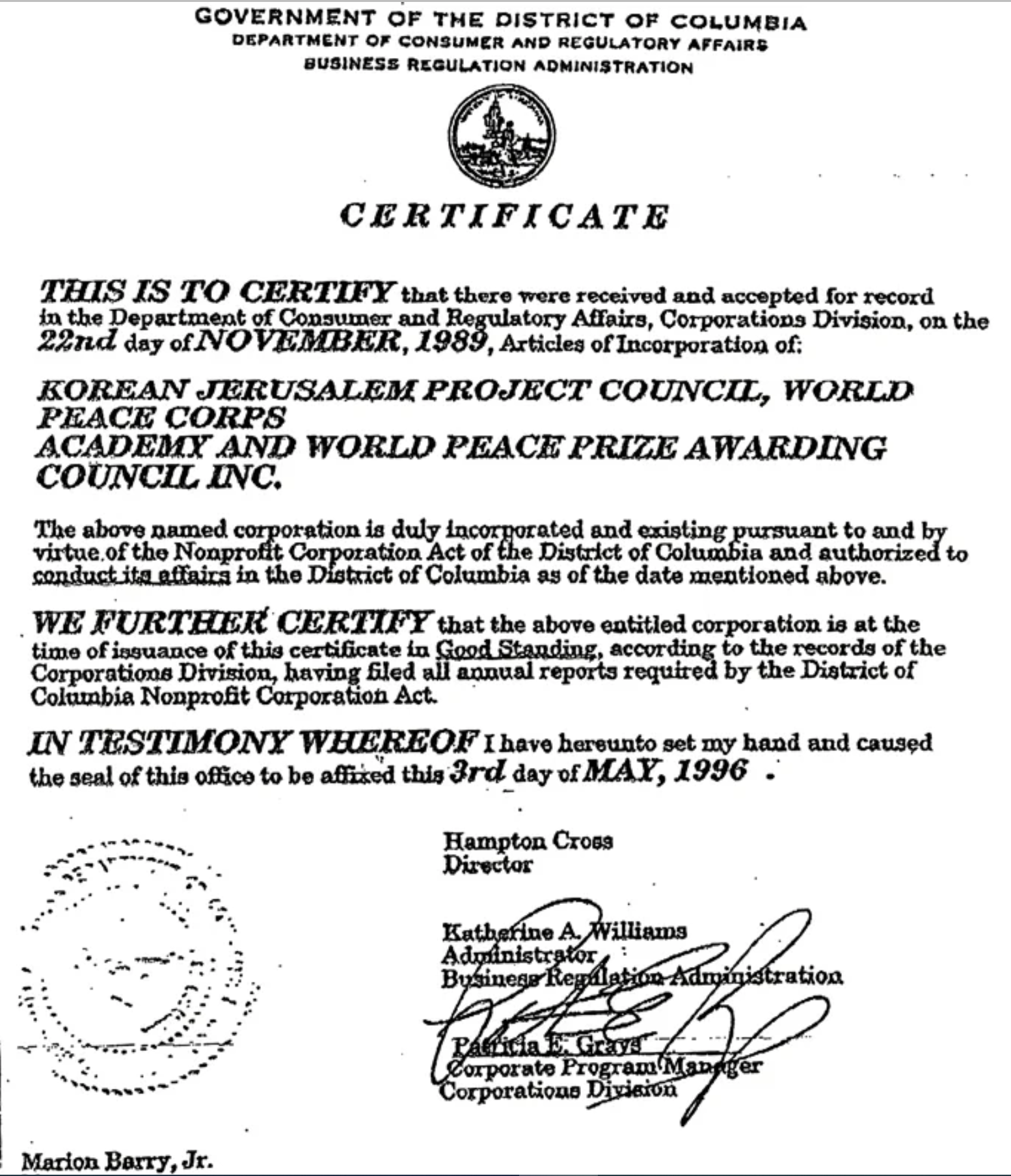 이에 Robert L. Leggett 박사 (1997년 작고)는 1981년 미국 대통령 Ronald Reagan의 취임식에서 Han, Min Su 박사 (2019년 작고)와 만나 상호 존중하는 관계로 발전시키고, 다시 오랜 준비후 1989년 11월 22일에 평화자원봉사단 (Peace Corps Volunteer Service Inc.)의 이념과 실행을 배경적 전승으로 개편한 세계평화군단 운동 (World Peace Corps Movement)으로서, 세계평화봉사단 (World Peace Corps Mission: WPCM), 세계평화시상위원회 (World Peace Prize Awarding Council Inc.:WPPAC), 세계평화군단사관학교 (World Peace Corps Academy-Megaversity: WPCAM)들을 한국예루살렘 프로젝트 협의회 (Korean Jerusalem Project Council Inc.: KJPC)와 함께 설립하고, 미국 워싱턴 D.C. 정부에 세금 면제 특권을 가진 비영리 기관으로 등록했다. 세계평화봉사단 (World Peace Corps Mission: WPCM)은 지속적으로 워싱턴 D.C. 정부로부터 우수한 지위로 인증을 받고 있다.