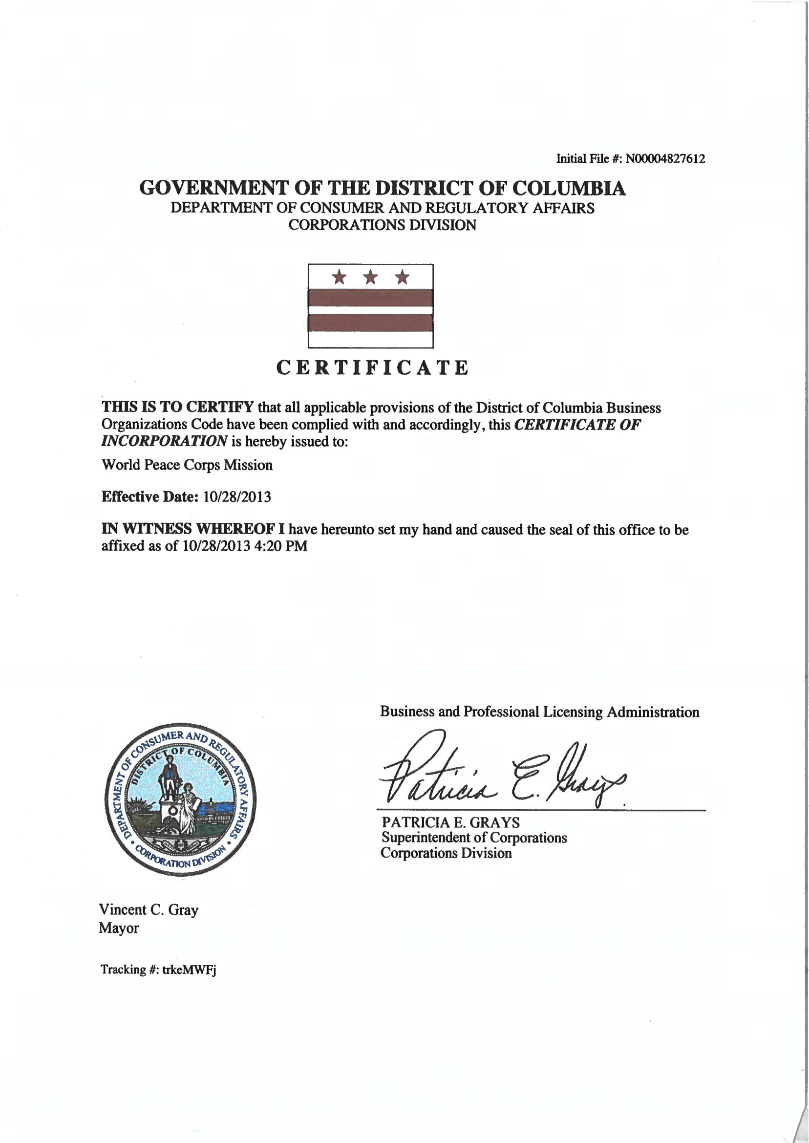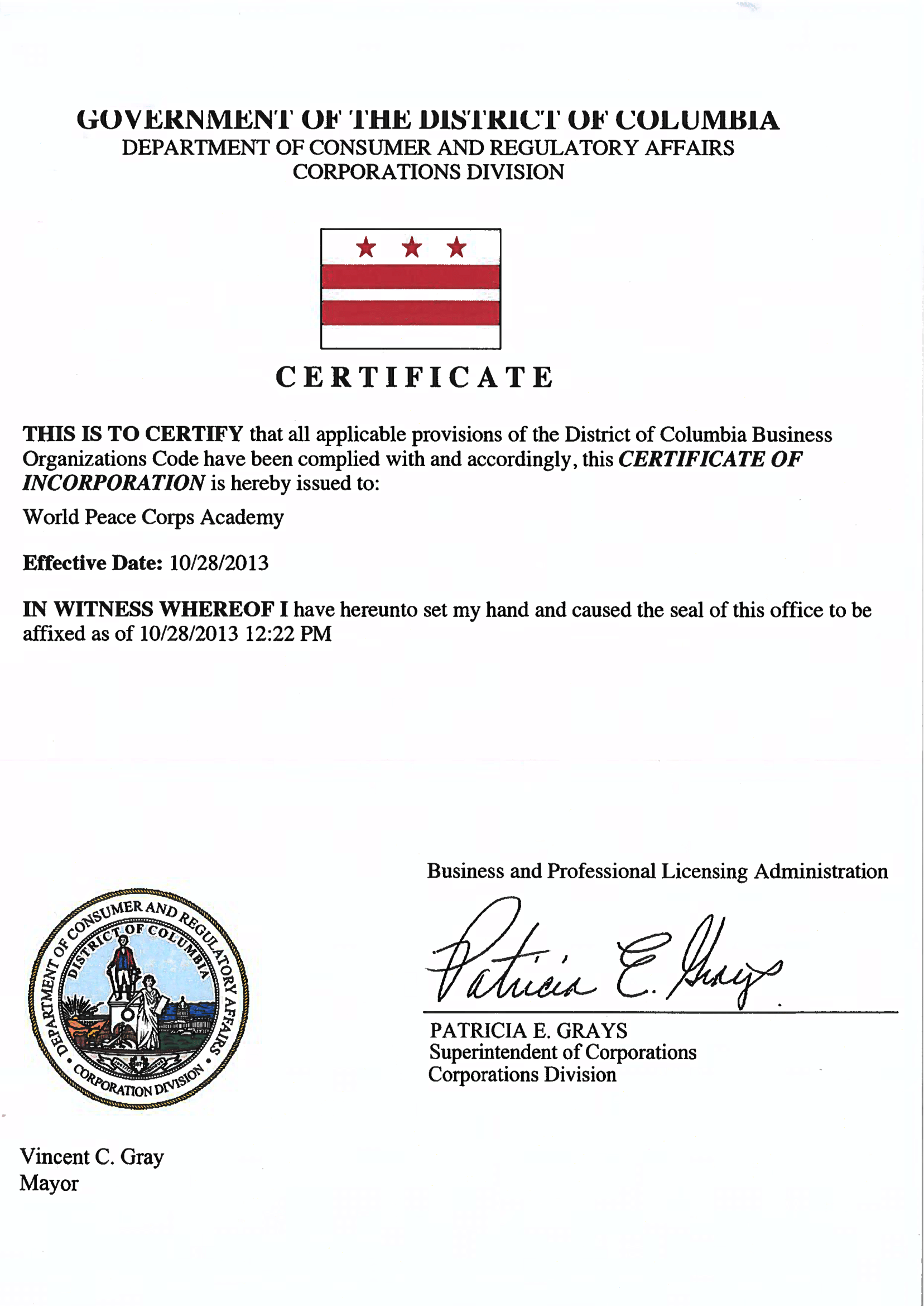 The World Peace Corps Foundation Established Background, Washington, D. C., USA